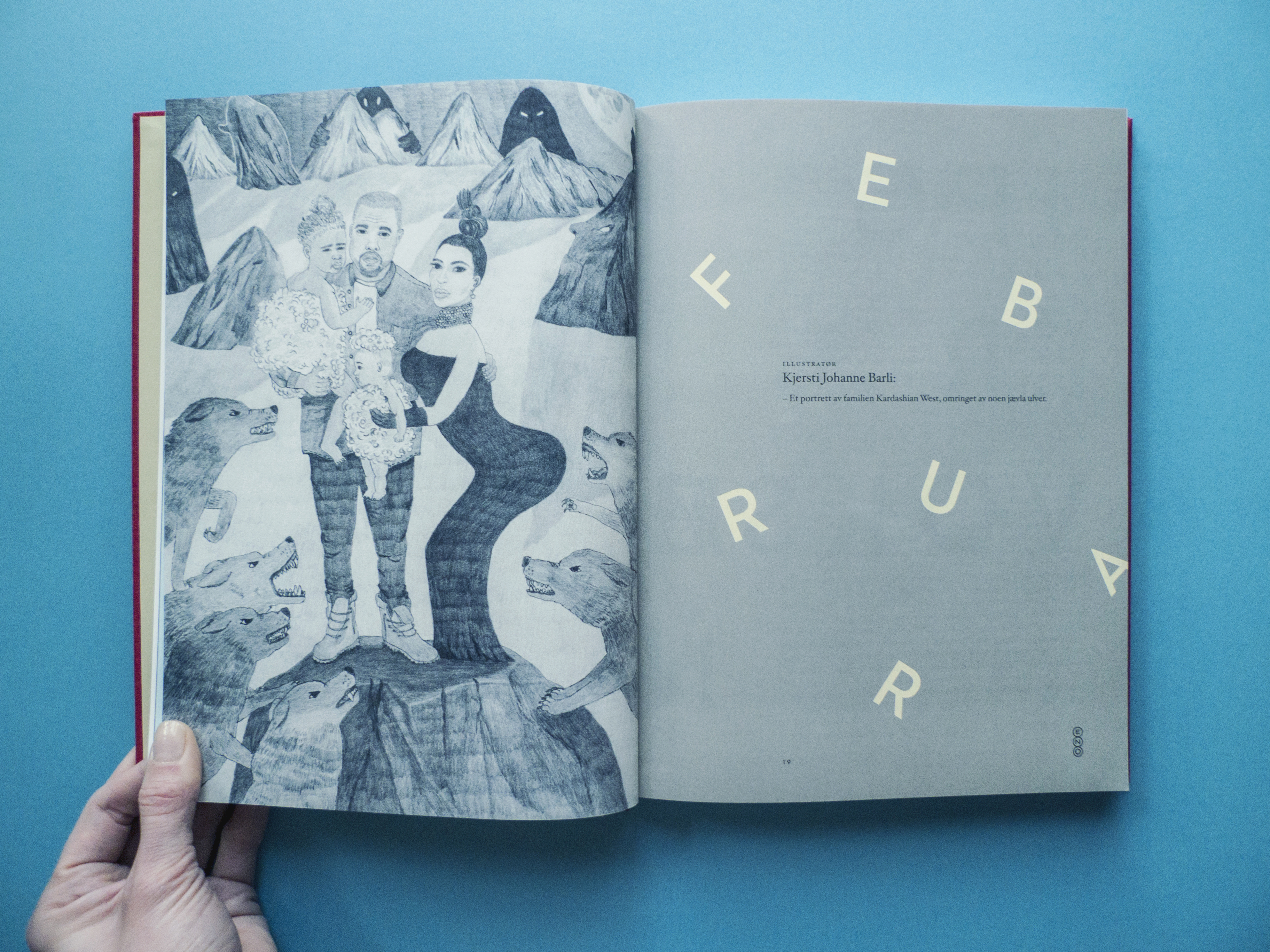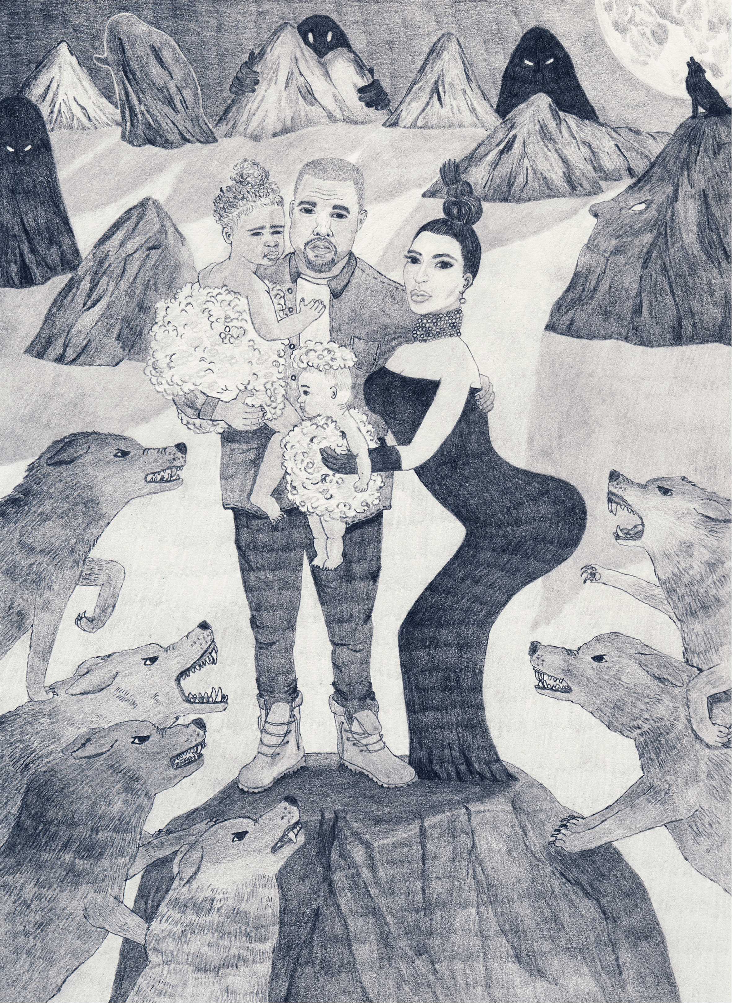This artwork is a portrait of the Kardashian West family, surrounded by what Kanye (at the time) described as “the fucking wolves” – literally. It is an illustration of the music month of February 2016.